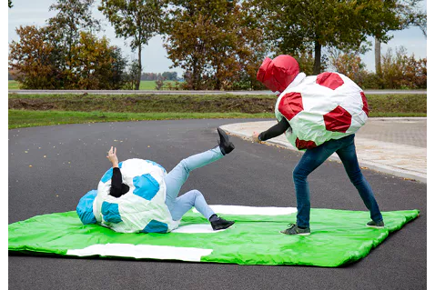 Sumo-Wrestling ist lustig und wahrscheinlich noch belustigender für die Zuseher! Zwei Kinder oder Erwachsene, die versuchen, in den Sumo Anzügen den anderen um zu werfen. Die Sumo Anzüge als Fußball sind so gestaltet, dass Kinder und Erwachsene die Anzüge leicht und schnell miteinander tauschen können. Bringst du deinen Gegner zuerst zu Boden?