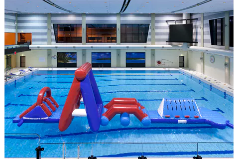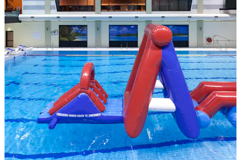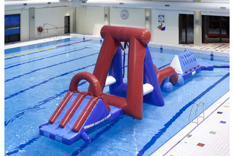 Der Wasserparcours Balance Run ist 15 Meter lang, voller herausfordernder Hindernisse und erstaunlichen Details. Dieser spektakuläre Hindernislauf verfügt über zwei Kletterwände, ein Balancier-Objekt, ein Tau zum Schwingen und eine Rutsche. Sie können ein Rennen gegen die Uhr machen oder 2 Personen gegeneinander antreten lassen. Ein sehr spannendes Spiel für auf dem Wasser. Spaß garantiert!
